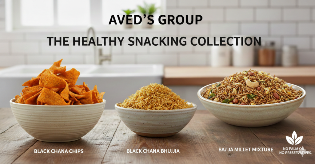 "Aved's Group healthy snack combo featuring three bowls: organic Bajra Millet Mixture, protein-rich Black Chana Bhujia, and crunchy Black Chana Chips, all made without palm oil."