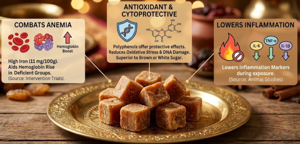Jaggery combats anemia with high iron content (11 mg/100g), aiding hemoglobin rise in deficient groups per intervention trials. Its polyphenols offer cytoprotective and antioxidant effects, reducing oxidative stress and DNA damage better than brown or white sugar. Animal studies show it lowers inflammation markers like IL-6, TNF-α, and IL-1β during arsenic exposure.